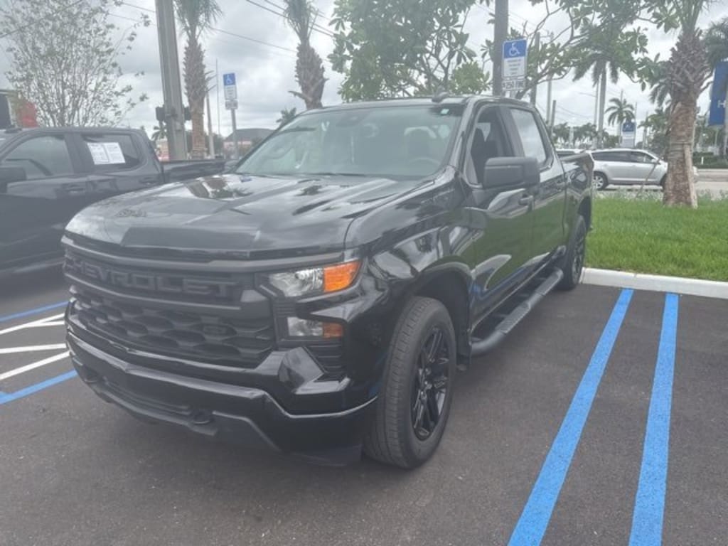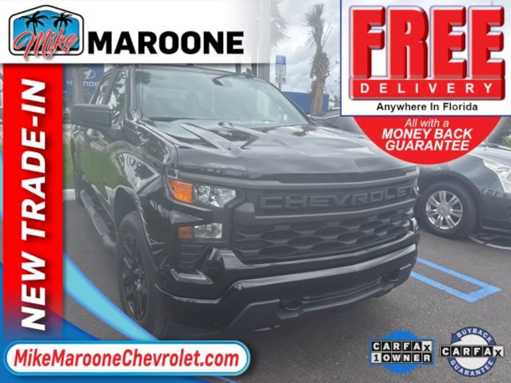 **CHEVROLET CERTIFIED**, 100,000 MILE WARRANTY**, 172 POINT CHEVROLET CERTIFIED INSPECTION**, FREE DELIVERY ANYWHERE IN FLORIDA**, 1 FREE MONTH ONSTAR (IF EQUIPPED)**, 3 FREE MONTHS XM RADIO (IF EQUIPPED)**, APPLE CARPLAY**, ANDROID AUTO**, AIR CONDITIONING**, BLUETOOTH - HANDS FREE**, CERTIFIED 1 OWNER VEHICLE**, CLEAN CARFAX - NO ACCIDENTS REPORTED**, FRESH OIL & FILTER CHANGE**, PASSIVE ENTRY SYSTEM**, KEYLESS OPEN**, KEYLESS START**, KEYLESS ENTRY**, CRUISE CONTROL**, POWER WINDOWS**, POWER LOCKS**, REAR BACK UP CAMERA**, SERVICE RECORDS AVAILABLE**, STEERING WHEEL AUDIO CONTROLS**, TIRE PRESSURE MONITOR SYSTEM**, 8-Speed Automatic, Black Cloth. 2023 Chevrolet Silverado 1500 Custom RWD Black Recent Arrival! Certified. Chevrolet Certified Pre-Owned Details:
