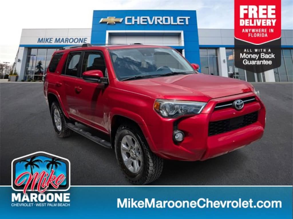 **FREE DELIVERY ANYWHERE IN FLORIDA**, 3 FREE MONTHS XM RADIO (IF EQUIPPED)**, 60 DAY POWERTRAIN WARRANTY**, AIR CONDITIONING**, BLUETOOTH - HANDS FREE**, FRESH OIL & FILTER CHANGE**, KEYLESS ENTRY**, CRUISE CONTROL**, POWER WINDOWS**, POWER LOCKS**, POWER SEAT**, REAR BACK UP CAMERA**, SERVICE RECORDS AVAILABLE**, STEERING WHEEL AUDIO CONTROLS**, TIRE PRESSURE MONITOR SYSTEM**, Black/Graphite Cloth. 2020 Toyota 4Runner SR5 RWD Red Recent Arrival! Certified. Certification Program Details: This 4RUNNER also comes with the FULL Mike Maroone 60-Day 3,000 Mile Warranty. We will review the technician's vehicle inspection report with you before purchase. Our intention is to provide you a completely transparent buying experience. At Mike Maroone our used vehicles are Safety Checked, Warrantied, CARFAX, and if you don't like it ... Bring it back! All of our new and used vehicles come with the Mike Maroone Preferred Owner Advantages listed below: - MARKET BASED PRICING - 3 DAY/150 MILE MONEY BACK GUARANTEE - FREE LOANERS FOR SERVICE GUESTS WHO SET AN ONLINE APPOINTMENT - 12 MONTH/12K MILE SERVICE/COLLISION GUARANTEE - 60 DAY LIMITED POWERTRAIN PRE-OWNED VEHICLE WARRANTY - MILITARY DEPLOYMENT BUYBACK GUARANTEE - FREE DELIVERY ANYWHERE IN FLORIDA For more information or vehicles like it, stop by Mike Maroone Chevrolet West Palm Beach today.